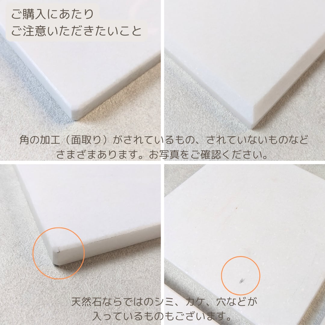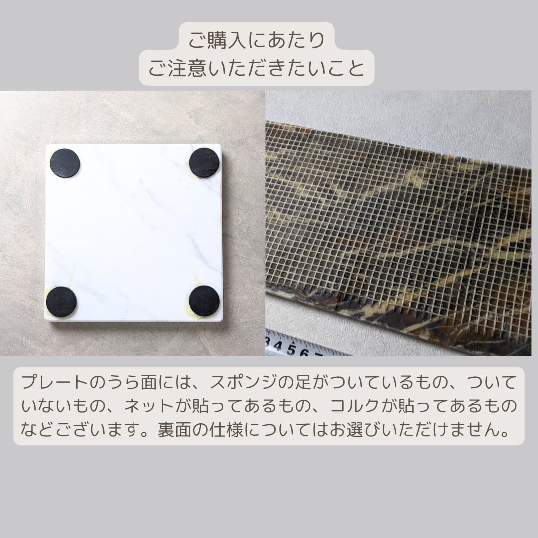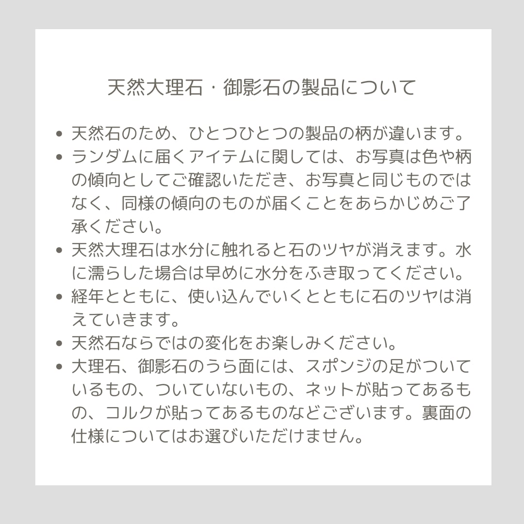 ・大理石のうら面には、スポンジの足がついているもの、ついていないもの、コルクが貼ってあるものなどございます。裏面の仕様についてはお選びいただけません。